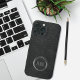 An iPhone 13 case with a minimalistic design showcasing a black leather look background accentuated by silver rings for your monogram that subtly embellish the case, creating a sleek and modern masculine look.