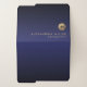 Minimal luxury monogram design with elegant brushed metallic gold monogram medallion with personalized name and title below on a trendy gradient background in shades of navy blue. Personalize for your custom use.