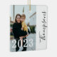 Minimal and modern non-traditional Christmas ornament featuring a simple and modern design with a family photo and trendy family name script. Bold year photo overlay. The reverse side features a second photo.