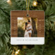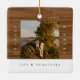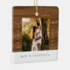 Celebrate your engagement with this elegant mid-century modern ornament, featuring a stylish faux brown wood and white two-tone design. A bold white stripe along the bottom highlights the couple’s name, while a minimalist square frame displays your favorite engagement photo. With one photo on each side, this ornament is a beautiful double-sided keepsake. The phrase “Engaged & Merry”, the year, and your names are displayed in a clean, modern font around the image – perfect for adding a personal touch to your holiday decor or gifting to a newly engaged couple. Design and Layout by ©Moodthology Papery