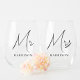 Chic set of stemless wine glasses for the bride and groom featuring "Mr" and "Mrs" in a thin minimal modern script and their married name in elegant typography.