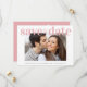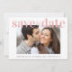 A fresh and cheerful save the date wedding announcement. "save the date" is written across the top of your favorite engagement photo in bold, clean and modern light blush pink typography, and underneath you can personalize your names, wedding date and location. On the reverse side, you can personalize your save the date information in more detail in a coordinating white typography against a light blush pink background.