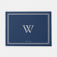 A doormat featuring a minimal style monogram framed in the center. Underneath this towards the bottom is the established date of your family. The background contains a deep navy. The outside border frame is silver to compliment the background along with the silver monogram.