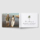 Add a tropical touch to your wedding with this Minimal Palm Tree guest book. The design features a single palm tree illustration at the top of the guest book. Personalize the palm tree wedding guest book with your names, date, and location in black lettering with a modern hand-lettered script accenting the design. Add custom text to the spine such as your names, wedding date, etc. The back of the simple tropical wedding guest book displays your favorite horizontal engagement photo. Designed to coordinate with our Minimal Palm Tree wedding collection.