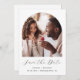 This simple, minimalist Save the Date card features a boho photo arch above the words "Save the Date" in elegant black handwriting script, followed by the couple's names, wedding date and city in sans serif font on a white background. Add a more detailed message with additional information on the reverse, along with a QR code that sends guests to your wedding website.