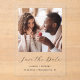 This simple, minimalist Save the Date card features a square photo above the words "Save the Date" in elegant black handwriting script, followed by the couple's names, wedding date and city in sans serif font on a clear background.