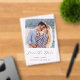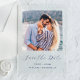 This simple, minimalist Save the Date announcement features a square photo above the words "Save the Date" in elegant navy blue handwriting script, followed by the couple's names, wedding date and city in sans serif font on a clear background.