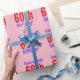 This minimal birthday-themed wrapping paper design features a message like "Have a great 60th birthday!", where the birthday number can be customized. Wrapping paper like this might be used to wrap gifts being given to celebrate somebody’s birthday. It features colors like pink, purple and red.