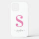 Minimal white case features a large pink monogram with your name in an elegant dark grey script font below it. Add your initial and name in the sidebar. Leave the box-shaped characters in the name field if you like the swashes (curving lines) at the beginning and end of the name. The first swash will only correctly line up with lower-case letters. Cases available for other models and devices in the sidebar.