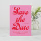 Retro wedding save the date featuring modern retro typography in pink and red color.