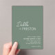 Modern olive / sage green wedding acrylic invitation featuring a simple and minimal design with the bride's name in an elegant script and the groom's name in a contemporary sans serif font. Below in the lower right corner are your event details in a minimalist layout.