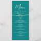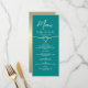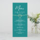 Simple, minimalist, modern teal wedding menu with gold rope heart and handwritten calligraphy script.