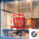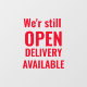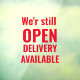 Let your customers know you’re still here for them with this bold red "We're Still OPEN – Delivery Available" window cling. Perfect for restaurants, takeout counters, grocery stores, and other small businesses offering delivery services. This large adhesive sign is designed for clear visibility, even from a distance. Easy to apply to windows or glass doors and fully customizable for your needs.