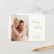 This save the date postcard features a modern minimalist design and is accented with simple gold script text. The postcard offers 2 photos, one on the front and a second on the back. Custom text on the back allows you to add more wedding details.