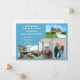 Minimalist, elegant, trendy moving announcement card with 4 custom photos, the names of family members, and the text "We've Moved! Come visit us soon!" + the new address and landline phone number on the front for you to personalize. Modern, chic pale turquoise blue background with white, blue, and teal writing.