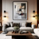 Geometric abstract art with circular and rectangular shapes in neutral tones of gray, beige and black. Textures resembling concrete and stone. Sophisticated minimalist style. Perfect for modern decoration and offices. Timeless design balancing form and texture in elegant and architectural composition.