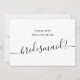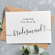 A minimalist bridesmaid proposal card featuring simple and elegant script on black and white would typically have a sleek and stylish look. The use of a black and white color palette creates a bold contrast and provides a modern and sophisticated feel. The script font would be clean and refined, adding a touch of elegance to the design. The minimalist layout would keep the focus on the wording, making it clear and easy to read. The use of negative space would create a sense of balance and simplicity, giving the card a minimalist and timeless look.