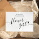 A minimalist Flower Girl proposal card featuring simple and elegant script on black and white would typically have a sleek and stylish look. The use of a black and white color palette creates a bold contrast and provides a modern and sophisticated feel. The script font would be clean and refined, adding a touch of elegance to the design. The minimalist layout would keep the focus on the wording, making it clear and easy to read. The use of negative space would create a sense of balance and simplicity, giving the card a minimalist and timeless look.