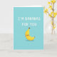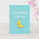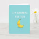 This greeting card shows a bright yellow banana character near the bottom of the front, set against a smooth sky-blue background. The banana has a big open smile, tiny dark eyes, and soft pink blush on its cheeks, so it looks sweet and a little bashful. A light gray shadow under it helps it feel grounded, even though the design stays simple. Across the top, the card reads “I’M BANANAS FOR YOU” in white, all-caps letters with a straightforward printed look. The message sits centered above the banana, making the joke easy to spot right away. It’s a cute way to say you’re really into someone without being too serious, and it can work for a partner or a close friend 🥰. The calm blue background and the happy face make it feel friendly, honest, and easy to give ❤️.