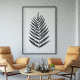 This modern minimalist botanical illustration features a simple palm frond leaf drawing in black and white.