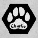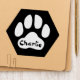 Personalized name with paw print patch. Simple dog paw print illustration with a custom name printed within the paw. Classic black and white color combination makes an elegant accent and decoration. Nice way to celebrate your pet dog or cat and show your love for them.
