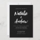 A simple and casual modern elegant wedding invitation featuring a photo of the couple at the back and a minimalist typography script lettering of the wedding details.