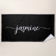 Girly Feminine Minimalist Simple Clean Black Monogram Name Signature Script Custom Personalized Summer Beach Towel. This design featuring your first name in a pretty hand lettered style swash tail font signature typography (or calligraphy) white script on black color background. These are easy to customize it. Great stylish feminine housewarming gift, also for birthday, wedding, sweet 16 birthday party, mother’s day, bridal shower, bachelorette party, for graduation party and It’s for the girl who likes simple clean things.