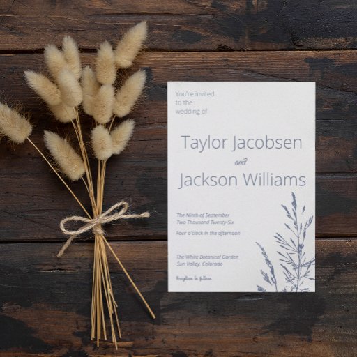 This original design is modern and simple in slate blue and white. This clean design is classy and timeless. The design features a square of slate blue with a large white border. The blue box contains white cript typography for names and is accented with a white graphic of grasses. Coordinating items available in my store.