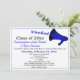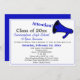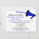 This horizontal format high school class reunion with blue megaphone invitation design features a minimalist blue and white design. Add your information to the template fields or click customize to select a typeface color, size, and style your prefer.