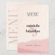 Indulge your guests with these elegant Minimalist Blush & Bloom Bold Script Wedding Menu Cards. Featuring a delicate blush and rose gold watercolor wash with subtle texture, these cards add a touch of love and romance to your wedding reception. On the front, "Menu" is displayed in bold script followed by the couple's names in bold script and the wedding date, city, and state. On the back, "Menu" is showcased in a striking large, vertical bold typography. From starters to entrées, desserts, and drinks, the menu is beautifully presented in a modern bold script. Customize all the text easily over this template, making it a delightful addition to your wedding reception tables.
