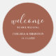 This is an elegant, minimal circle round welcome sticker. A terracotta background with delicate script typography, where "welcome to our wedding" is written above bride and groom names and wedding date. Simple and clean.