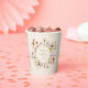 Wedding favor paper cups featuring personalized names and date with wildflower floral background design.