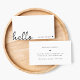 A minimal business card design featuring a stylish handwritten script typography quote “hello” paired with your name and a simple black heart on a clean white background. Designed in a modern minimalist style, this elegant card blends personality with professionalism. Perfect for creatives, small business owners, or anyone looking for a unique yet simple introduction card. The clean white layout and bold script make it easy to customize with your name, title, and contact details for a personal touch. Ideal for networking, boutiques, or creative brands wanting a fresh, friendly aesthetic that feels approachable and contemporary while staying effortlessly stylish.