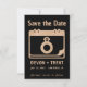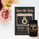Modern and minimalist style Save the Date announcement features rose gold glitter calendar icon with customizable text on charcoal gray background.