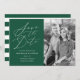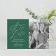 Elegant photo save the date cards featuring "Save the Date" displayed in a white calligraphy script with a green background. Personalize the green save the dates with your vertical engagement photo, names, wedding date, and location. The back of the modern save the date card features green and white stripes.
