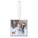 A stylish modern christmas tree ornament with a modern minimal typography quote "all is merry and bright" paired with a handwritten script font for your family name in white with a slate gray feature color in a 'scandi' scandinavian design style. The greeting and name can be easily customized for a personal touch. A trendy, minimalist and contemporary design to stand out this holiday season! The image shown is for illustration purposes only to be replaced with your own photo. The placeholder image is of a happy young couple collecting wood in the snow with thier dogs, a husky and a small terrier.