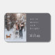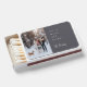A stylish modern holiday photo matchbox design with a modern minimal typography quote "all is merry and bright" paired with a handwritten script font for your family name in white with a slate gray feature color in a 'scandi' scandinavian design style. The greeting and name can be easily customized for a personal touch. A trendy, minimalist and contemporary design to stand out this holiday season! The image shown is for illustration purposes only to be replaced with your own photo. The placeholder image is of a happy young couple collecting wood in the snow with thier dogs, a husky and a small terrier.