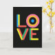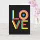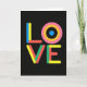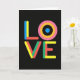 This greeting card features the word “LOVE” in big capital letters centered on a deep black background. Each letter is built from rounded, tube-like shapes that overlap, giving the design a soft, slightly 3D look. The “L” mixes blue, yellow, and red pieces, and it feels friendly and energetic without being busy. The “O” looks like a set of colorful rings—pink around yellow with a blue center—almost like a bright target or an eye looking back with warmth. The “V” is made from yellow, red, and green sections that cross in a lively, slightly uneven way, and the “E” finishes with green, yellow, and red strokes that match the same style. The only text is “LOVE,” and it appears as chunky, rounded letter shapes rather than a thin letter style, placed right in the middle so it’s the first thing you notice ❤️. It feels meaningful because it says what you mean right away, while the colors add a gentle sense of joy that fits romance or close friendship 🥰, making it easy to share Valentine’s Day.