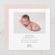 A beautiful minimalist birth announcement to announce the arrival of your little girl. This square announcement features your favorite photo of your daughter and text in modern grey font. Underneath is an illustration of a bow. The reverse is in solid blush pink.