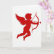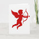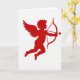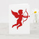 This greeting card shows a red silhouette of Cupid flying across a plain white background. Cupid’s wings are spread wide, his legs are bent as if he’s gliding, and you can see a little curl of hair on his head. He holds a bow pulled tight, with an arrow ready to release, aimed toward the right side of the card. The strong red-on-white look keeps your attention on the moment right before the arrow flies, which feels full of hope and romance ❤️. There aren’t any extra objects or scenery, so the simple setting makes the message feel direct and sincere. There’s no text on the front, which leaves room for your own words inside and makes the image speak for itself 🥰. It’s a meaningful choice when you want to say “I care about you” in a classic, straightforward way. Share it to help pass along sweet Valentine’s Day feelings.