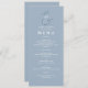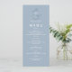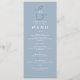 Simple, contemporary, minimal dusty blue wedding menu with modern calligraphy and trendy elegant ampersand.