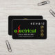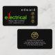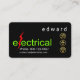 An all black cover features a creative green "electrical" signage where the letter "L" is replaced by a red lightning bolt. Just below the signage are the phone and email contacts. At the top right corner stands your prestigious name alongside an array of gold electrical icon logos. The first symbol can represent the home electrical circuit, the second the power plug for all electrical connections-equipment and finally the bulb with the repair tools as its filament.