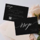 Simplify your wedding planning with our Minimalist Elegant Black Wedding RSVP Card. Featuring a sleek black background with clean, modern typography, this RSVP card embodies minimalist elegance. The refined design focuses on simplicity and sophistication, making it perfect for contemporary and stylish weddings. The monochrome color scheme provides a timeless look that complements any wedding theme. With sections for guests to indicate their attendance and meal preferences, this card is both practical and beautiful. Personalize it with your wedding details for a cohesive and personalized touch. Ideal for couples who appreciate modern aesthetics, our Minimalist Elegant Black Wedding RSVP Card adds a touch of understated luxury to your wedding stationery.