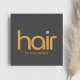 Elegant SQUARE customizable business card template with dark grey background and bold hair text/golden color. Minimal elegant design, perfect for hair salon, hairstylist, hairdresser.