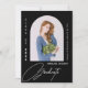 Modern solid black and white script graduation announcement card with a trendy arch shape photo and elegant contemporary typography.