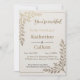 An elegant and minimalist wedding invitation or stationery template featuring delicate gold-toned leaf branches. The design showcases symmetrical floral arrangements in the top-left and bottom-right corners, framing a clean, off-white central space.