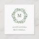These elegant business cards feature a wreath of watercolor green leaves and a few tiny berries with your monogram in the center, on a clean white background.