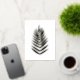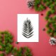 This modern minimalist botanical illustration features a simple palm frond leaf drawing in gold foil and white.