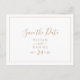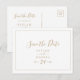 This minimalist gold horizontal save the date postcard is perfect for a simple wedding. The modern romantic design features classic gold and white typography paired with a rustic yet elegant calligraphy with vintage hand lettered style. Customizable in any color. Keep the design simple and elegant, as is, or personalize it by adding your own graphics and artwork.