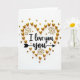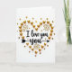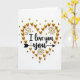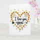 This card shows an overhead view of a white background sprinkled with shiny gold heart shapes. In the middle, the words “I love you” appear in a flowing black letter style, easy to read and placed right at the center. The message sits inside a heart outline made from many small gold hearts, some puffy and glossy and others flatter like tiny confetti. Around the heart, a few gold starburst shapes add little flashes of light, like sparks in a celebration. Under the word “you,” there’s a slim black arrow that points along the line and makes the message feel directed to one person. The simple black-and-gold look feels romantic and focused, like you’re saying something important without a lot of extra noise 🥰. It’s a meaningful card to give when you want to be clear about love and care, and it’s perfect for sharing Valentine’s Day sentiments ❤️.